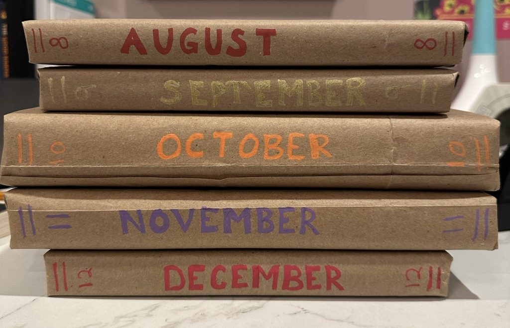 I went to her house at the end of July and stole 5 books, brought them home, and wrapped them in paper grocery bags. Honestly it felt like I was back in middle school covering my school books! Then I drew on the covers and spines for the month she should read them. She then came to my house to take 5 of my books and wrap them for me. On August 1st we unwrapped our books. My choice for her was This Summer Will be Different by Carley Fortune, a summertime romance based in Prince Edward Island that also featured a strong relationship with the character’s best friend. Her pick for me was Real Americans by Rachel Khong, a book that she had recently read and found wonderful.