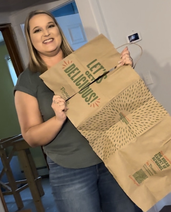 She thought it would be funny to pick a spicy book and wrap it in a Panera bag that said Let’s Get Delicious…until she accidentally cut the wrong side!