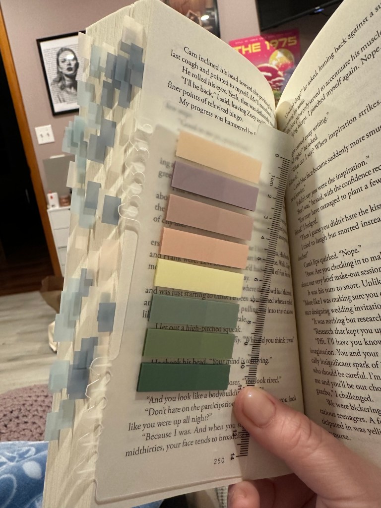 The tabs quickly took over! I started using blue to mark funny moments or lines. Then I ran out of the first shade of blue, and moved on to the second shade. When I ran out of that one I had to switch to green! This book had me laughing out loud. I couldn’t wait for my friends to read it so I had someone to talk to. So of course, I chose it for my April pick for the Hoppily Ever After Book Club.
